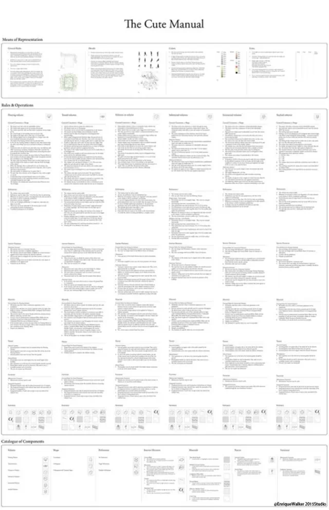 通过持续地重复一系列的设计语汇,日本建筑师在设计风格上趋于统一。很多方案的设计手法可以从其他相似案例找到设计源头。整个STUDIO在Enrique Walker (AAD director)的带领下,编撰了“Cute Manual”。将日本小清建筑按照设计手法,分成六类。每一类建筑都详细的限制了体块、开口、材料、植物还有室内家具的各种特点。并且限定了其特殊的建筑表现形式。
