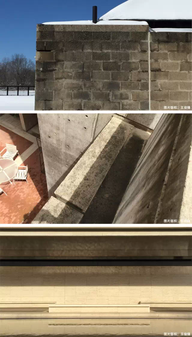 康较多运用砖、混凝土、砌块、石灰石,这些材料本身给人的感觉都很重,很密实,但在这三个房子里,现场看下来,这种厚重和密实性却被削弱甚至瓦解,材料看起来变得很轻、很薄甚至很透,丝毫没有压抑之感。这一方面得益于康对于建构的一丝不苟,对于材料越诚恳和真实,出来的效果也就越会出现“不真实”的美;另一方面则得益于他对自然力量的细腻把控,光、影、水的引入,或者说这些“可移动”的材料的进入,使得混凝土、石头这样的“不可移动”的材料变得异质(Transmateriality)。浴场混凝土砌块在光与雪的作用下,看起来好似皮肤一样柔软、温暖;沙尔克研究中心中央广场的石灰石铺地在雨或者夕阳的作用下,变得如湖面一样光滑、透亮;金贝尔美术馆的拱顶光线更是如一村老师所言,将混凝土变得像绸缎一样柔软、轻薄、通透。